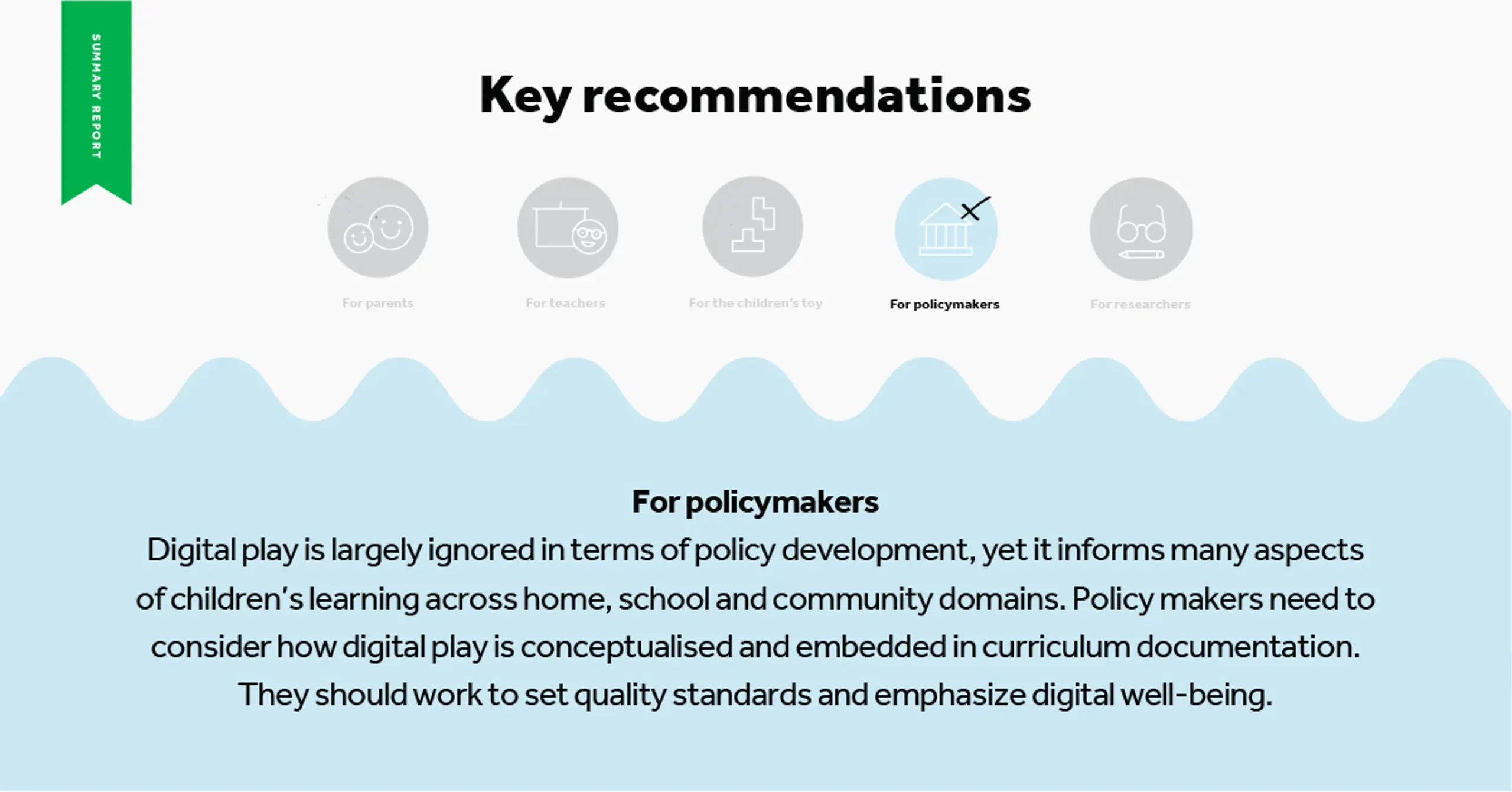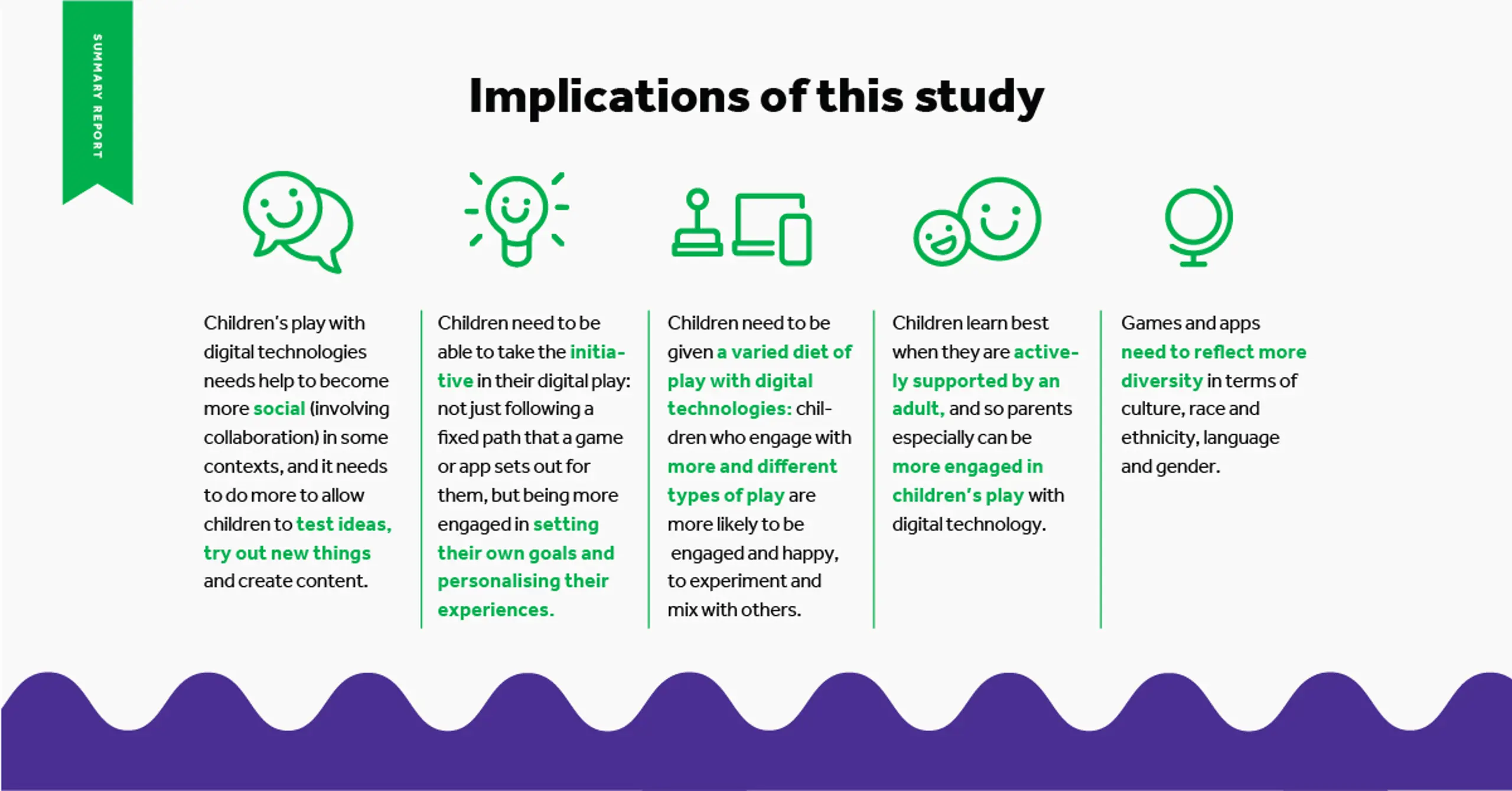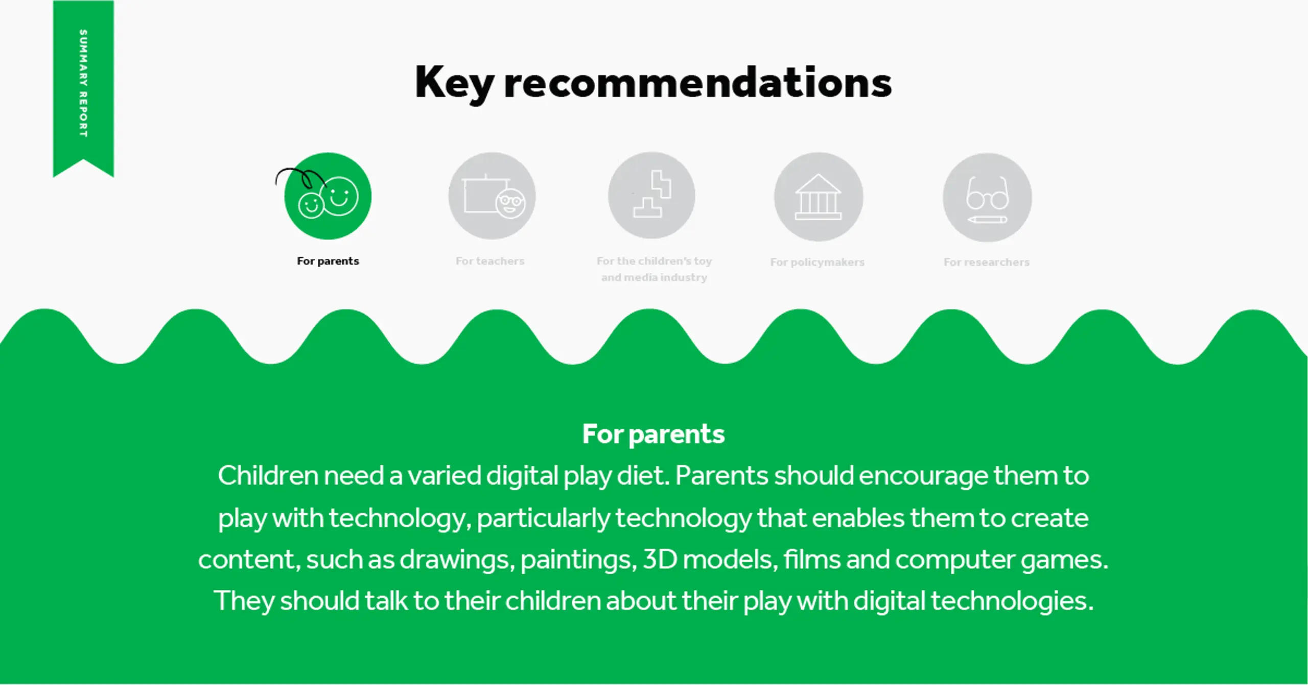 Above all, the involvement of adults is vital: adults have a crucial role in supporting children’s play with digital technologies, and engaging with it. Some parents, however, continue to have a negative view of children’s play that involves digital technology: they have concerns about children spending too much time on it, as well as concerns around privacy and suitability of content.