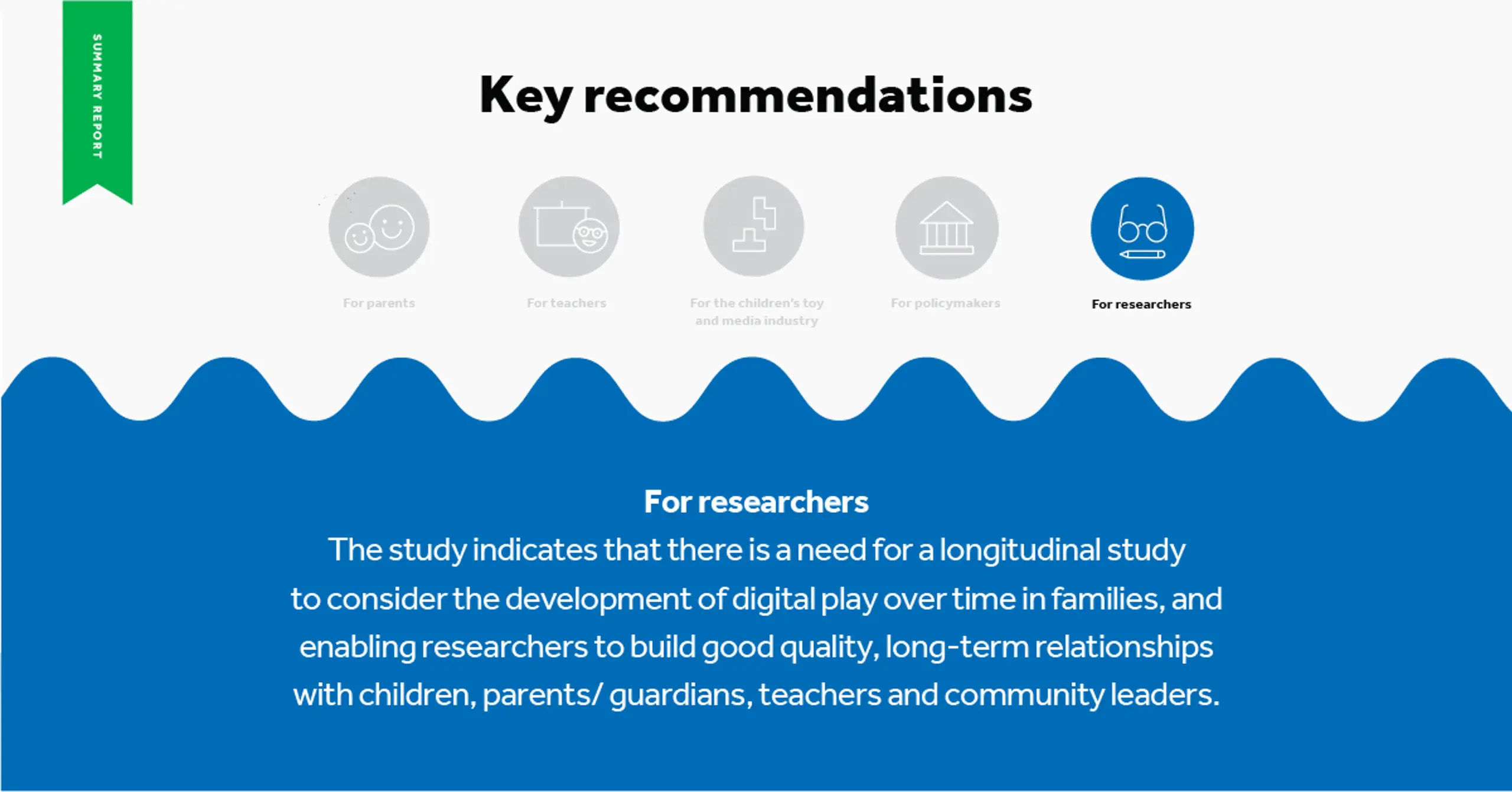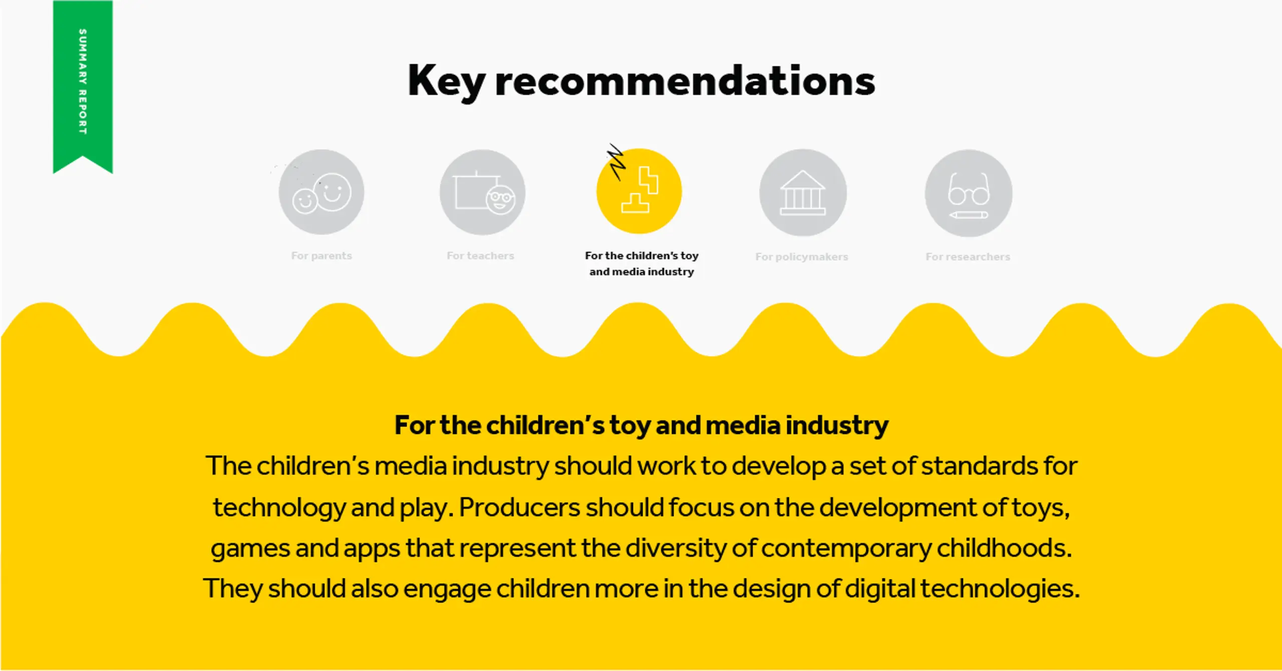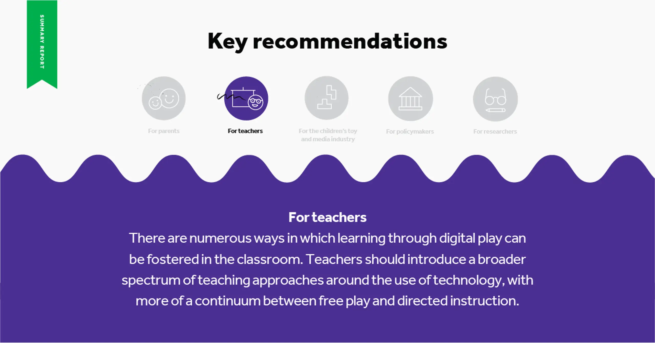 Above all, the involvement of adults is vital: adults have a crucial role in supporting children’s play with digital technologies, and engaging with it. Some parents, however, continue to have a negative view of children’s play that involves digital technology: they have concerns about children spending too much time on it, as well as concerns around privacy and suitability of content.